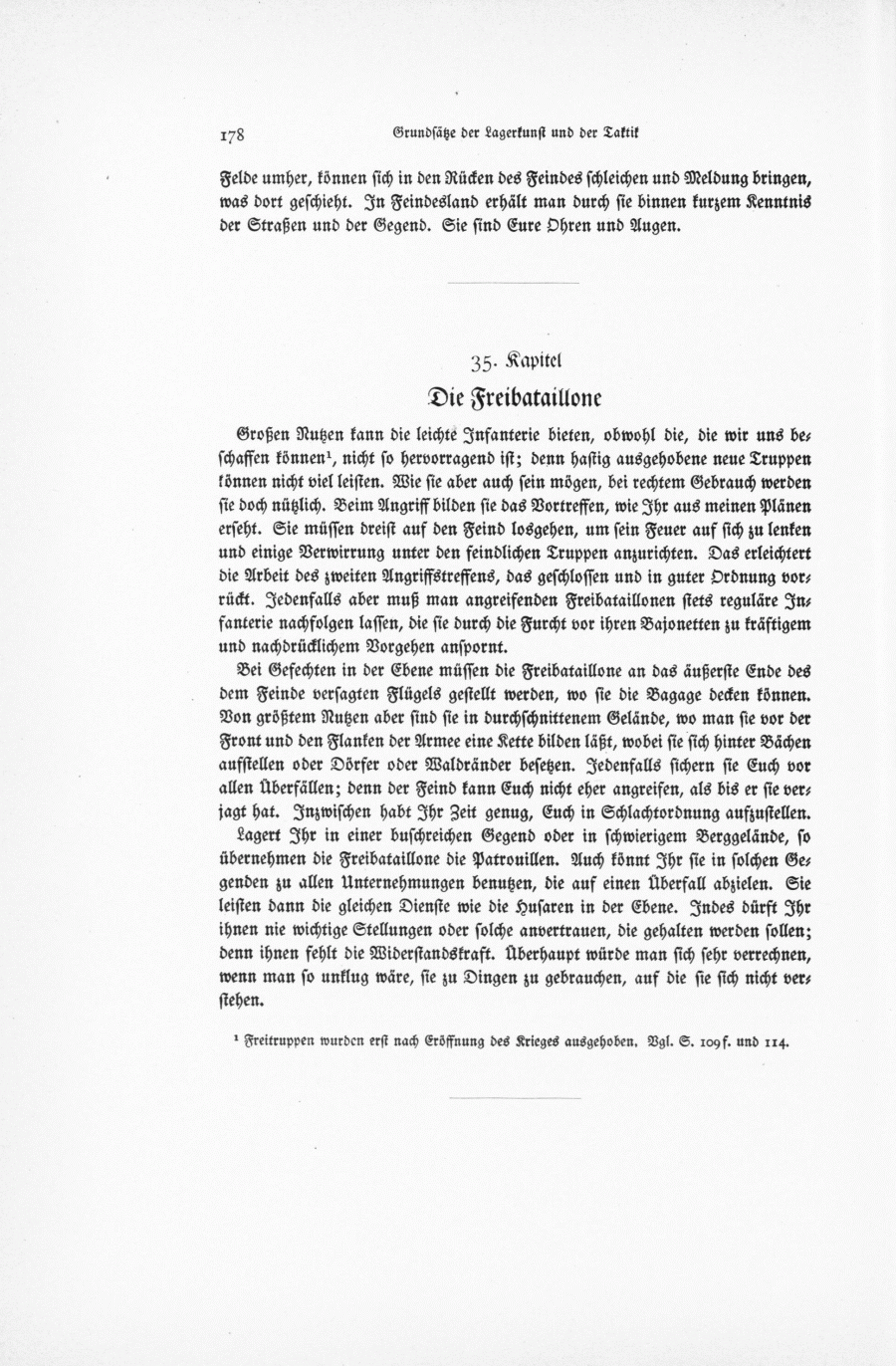 Lagert Ihr in einer buschreichen Gegend oder in schwierigem Berggelände, so übernehmen die Freibataillone die Patrouillen. Auch könnt Ihr sie in solchen Gegenden zu allen Unternehmungen benutzen, die auf einen Überfall abzielen. Sie leisten dann die gleichen Dienste wie die Husaren in der Ebene. Indes dürft Ihr ihnen nie wichtige Stellungen oder solche anvertrauen, die gehalten weiden sollen; denn ihnen fehlt die Widerstandskraft. Überhaupt würde man sich sehr verrechnen, wenn man so unklug wäre, sie zu Dingen zu gebrauchen, auf die sie sich nicht verstehen.