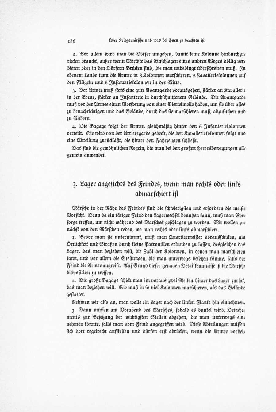 1. Bevor man sie unternimmt, muß man Quartiermeister vorausschicken, um Örtlichkeit und Straßen durch kleine Patrouillen erkunden zu lassen, desgleichen das Lager, das man beziehen will, die Zahl der Kolonnen, in denen man marschieren kann, und vor allem die Stellungen, die man unterwegs besetzen könnte, falls der Feind die Armee angreift. Auf Grund dieser genauen Detailkenntnisse ist die Marschdisposition zu treffen.