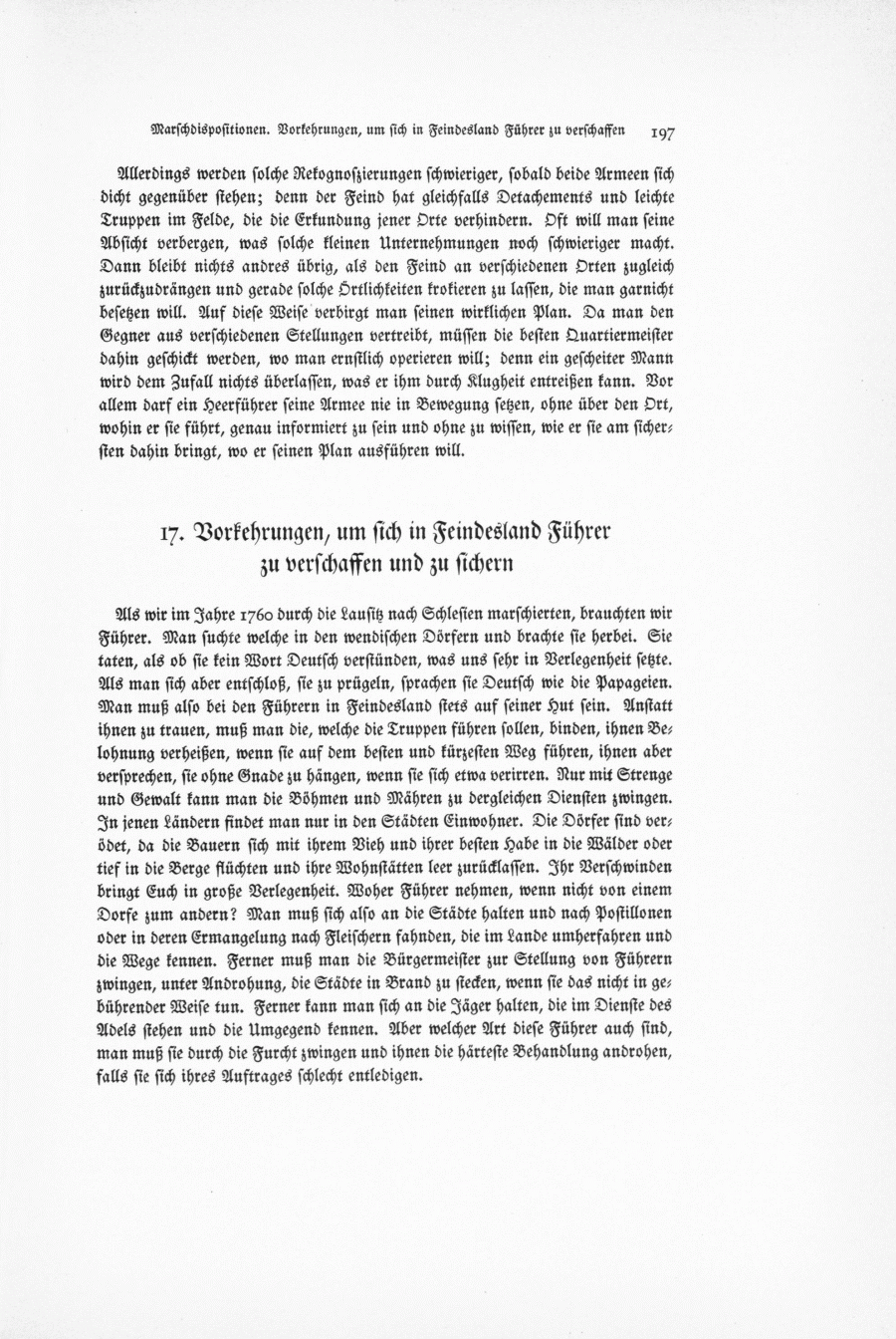 Als wir im Jahre 1760 durch die Lausitz nach Schlesien marschierten, brauchten wir Führer. Man suchte welche in den wendischen Dörfern und brachte sie herbei. Sie taten, als ob sie kein Wort Deutsch verstünden, was uns sehr in Verlegenheit setzte. Als man sich aber entschloß, sie zu prügeln, sprachen sie Deutsch wie die Papageien. Man muß also bei den Führern in Feindesland stets auf seiner Hut sein. Anstatt ihnen zu trauen, muß man die, welche die Truppen führen sollen, binden, ihnen Belohnung verheißen, wenn sie auf dem besten und kürzesten Weg führen, ihnen aber versprechen, sie ohne Gnade zu hängen, wenn sie sich etwa verirren. Nur mit Strenge und Gewalt kann man die Böhmen und Mähren zu dergleichen Diensten zwingen. In jenen Ländern findet man nur in den Städten Einwohner. Die Dörfer sind verödet, da die Bauern sich mit ihrem Vieh und ihrer besten Habe in die Wälder oder tief in die Berge flüchten und ihre Wohnstätten leer zurücklassen. Ihr Verschwinden bringt Euch in große Verlegenheit. Woher Führer nehmen, wenn nicht von einem Dorfe zum andern? Man muß sich also an die Städte halten und nach Postillonen oder in deren Ermangelung nach Fleischern fahnden, die im Lande umherfahren und die Wege kennen. Ferner muß man die Bürgermeister zur Stellung von Führern zwingen, unter Androhung, die Städte in Brand zu stecken, wenn sie das nicht in gebührender Weise tun. Ferner kann man sich an die Jäger halten, die im Dienste des Adels stehen und die Umgegend kennen. Aber welcher Art diese Führer auch sind, man muß sie durch die Furcht zwingen und ihnen die Härteste Behandlung androhen, falls sie sich ihres Auftrages schlecht entledigen.