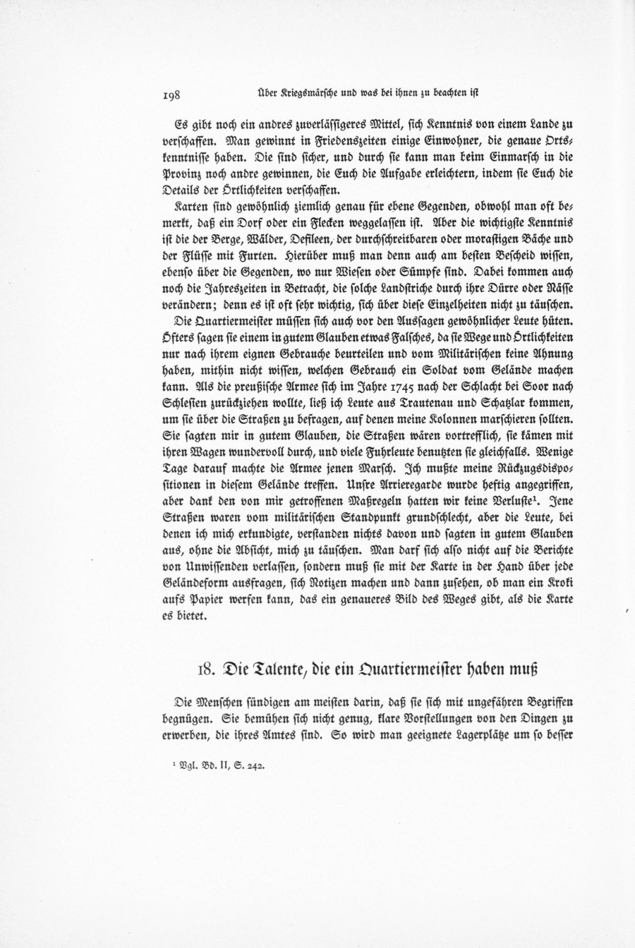 Die Quartiermeister müssen sich auch vor den Aussagen gewöhnlicher Leute hüten. öfters sagen sie einem in gutem Glauben etwas Falsches, da sie Wege und Örtlichkeiten nur nach ihrem eignen Gebrauche beurteilen und vom Militärischen keine Ahnung haben, mithin nicht wissen, welchen Gebrauch ein Soldat vom Gelände machen kann. Als die preußische Armee sich im Jahre 1745 nach der Schlacht bei Soor nach Schlesien zurückziehen wollte, ließ ich Leute aus Trautenau und Schatzlar kommen, um sie über die Straßen zu beftagen, auf denen meine Kolonnen marschieren sollten. Sie sagten mir in gutem Glauben, die Straßen wären vortrefflich, sie kämen mit ihren Wagen wundervoll durch, und viele Fuhrleute benutzten sie gleichfalls. Wenige Tage darauf machte die Armee jenen Marsch. Ich mußte meine Rückzugsdispositionen in diesem Gelände treffen. Unsre Arrieregarde wurde heftig angegriffen, aber dank den von mir getroffenen Maßregeln hatten wir keine Verluste1. Jene Straßen waren vom militärischen Standpunkt grundschlecht, aber die Leute, bei denen ich mich erkundigte, verstanden nichts davon und sagten in gutem Glauben aus, ohne die Absicht, mich zu täuschen. Man darf sich also nicht auf die Berichte von Unwissenden verlassen, sondern muß sie mit der Karte in der Hand über jede Geländeform ausfragen, sich Notizen machen und dann zusehen, ob man ein Kroki aufs Papier werfen kann, das ein genaueres Bild des Weges gibt, als die Karte es bietet.
