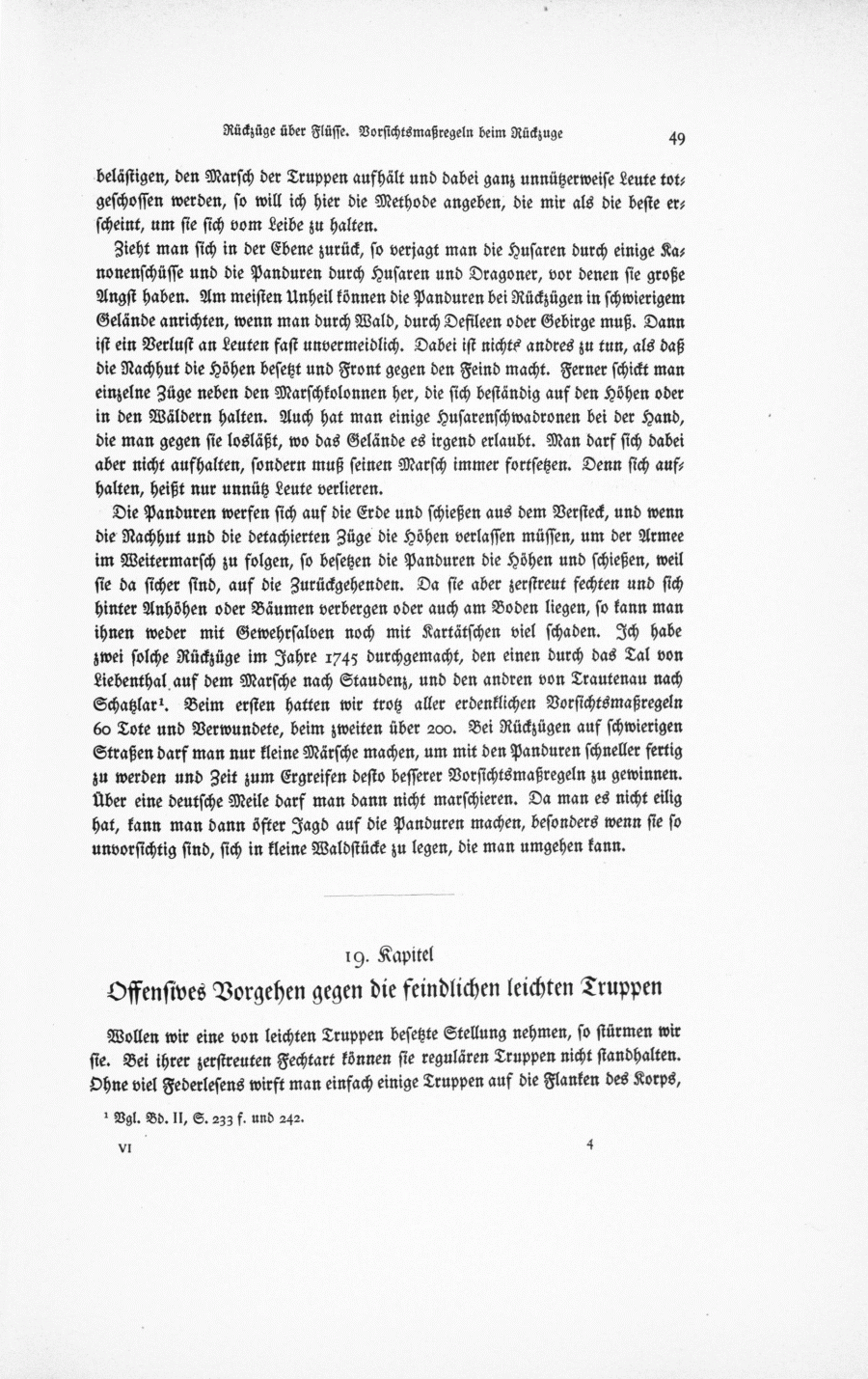 Zieht man sich in der Ebene zurück, so verjagt man die Husaren durch einige Kanonenschüsse und die Panduren durch Husaren und Dragoner, vor denen sie große Angst haben. Am meisten Unheil können die Panduren bei Rückzügen in schwierigem Gelände anrichten, wenn man durch Wald, durch Defileen oder Gebirge muß. Dann ist ein Verlust an Leuten fast unvermeidlich. Dabei ist nichts andres zu tun, als daß die Nachhut die Höhen besetzt und Front gegen den Feind macht. Ferner schickt man einzelne Züge neben den Marschkolonnen her, die sich beständig auf den Höhen oder in den Wäldern halten. Auch hat man einige Husarenschwadronen bei der Hand, die man gegen sie losläßt, wo das Gelände es irgend erlaubt. Man darf sich dabei aber nicht aufhalten, sondern muß seinen Marsch immer fortsetzen. Denn sich aufhalten, heißt nur unnütz Leute verlieren.