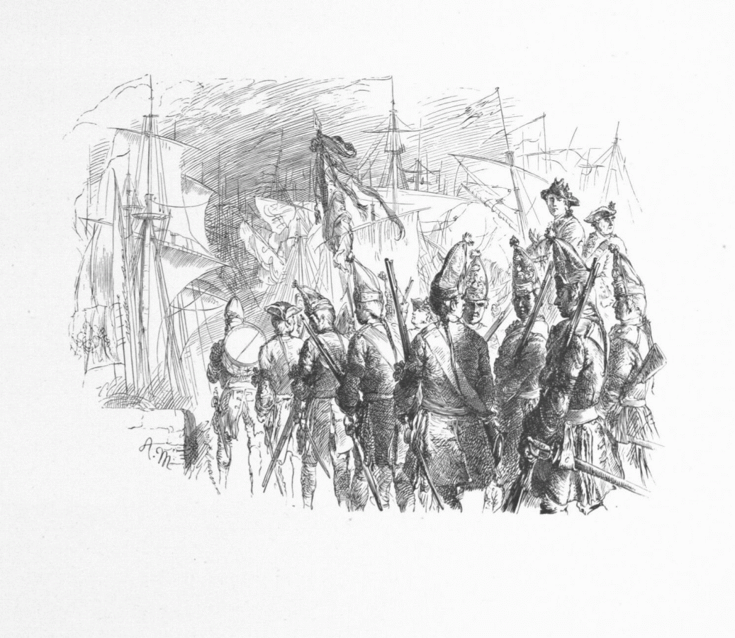 38. Embarquement de l'infanterie Anglaise. (Chap. XIII de l'„Histoire de la guerre de Sept ans“. - Gravure d'Unzelmann.)