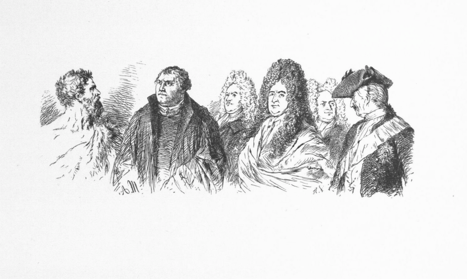 Portraits de Luther, de Leibnitz, de Thomasius et du duc d'Anhalt, en face d'un germain des temps primitifs. („Dissertation sur les Coutumes du Brandebourg“. - Gravure d'A. Vogel.)