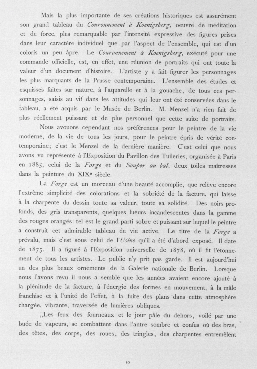 Nous avouons cependant nos préférences pour le peintre de la vie moderne, de la vie de tous les jours, pour le peintre épris de vérité contemporaine; c'est le Menzel de la dernière manière. C'est celui que nous avons vu représenté à l'Exposition du Pavillon des Tuileries, organisée à Paris en 1885, celui de la Forge et du Souper au bal, deux toiles maîtresses dans la peinture du XIXe siècle.