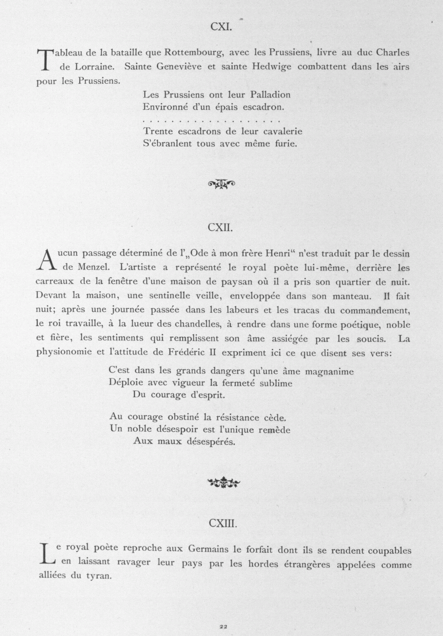 Aucun passage déterminé de l' „Ode à mon frère Henri“ n'est traduit par le dessin de Menzel. L'artiste a représenté le royal poète lui-même, derrière les carreaux de la fenêtre d'une maison de paysan où il a pris son quartier de nuit. Devant la maison, une sentinelle veille, enveloppée dans son manteau. Il fait nuit; après une journée passée dans les labeurs et les tracas du commandement, le roi travaille, à la lueur des chandelles, à rendre dans une forme poétique, noble et fïère, les sentiments qui remplissent son âme assiégée par les soucis. La physionomie et l'attitude de Frédéric II expriment ici ce que disent ses vers: