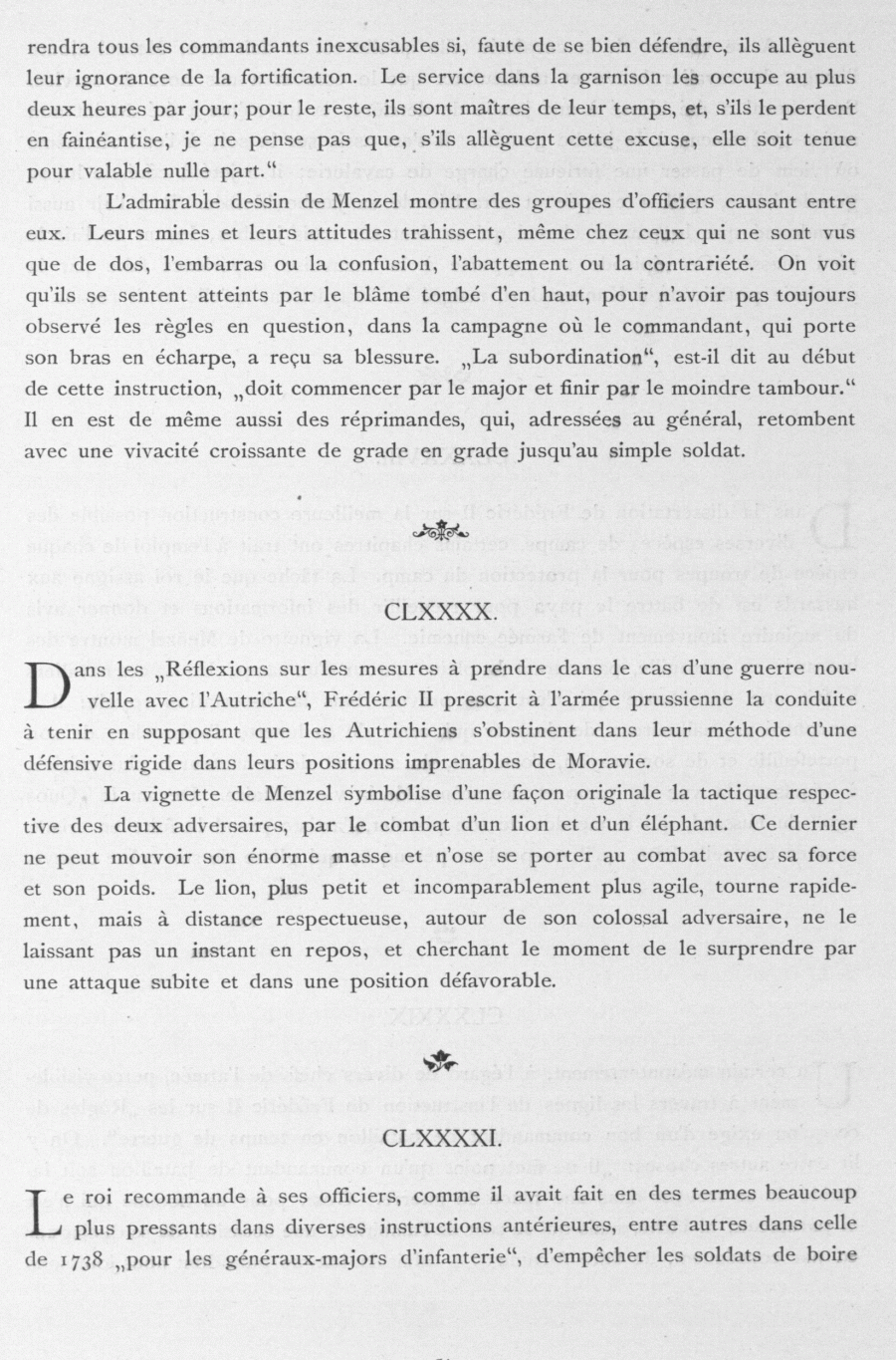 L'admirable dessin de Menzel montre des groupes d'officiers causant entre eux. Leurs mines et leurs attitudes trahissent, même chez ceux qui ne sont vus que de dos, l'embarras ou la confusion, l'abattement ou la contrariété. On voit qu'ils se sentent atteints par le blâme tombé d'en haut, pour n'avoir pas toujours observé les règles en question, dans la campagne où le commandant, qui porte son bras en écharpe, a reçu sa blessure. „La subordination“ , est-il dit au début de cette instruction, „doit commencer par le major et finir par le moindre tambour.“ Il en est de même aussi des réprimandes, qui, adressées au général, retombent avec une vivacité croissante de grade en grade jusqu'au simple soldat.