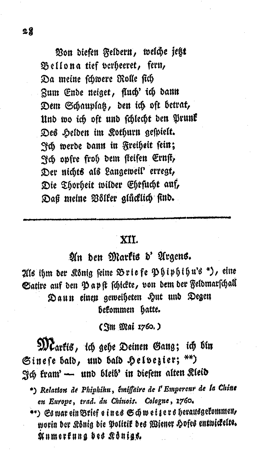 An den Markis d’Argens, als ihm der König seine Briefe Phiphihus, eine Satire auf den Papst schickte, von dem der Feldmarschall Daun einen geweiheten Hut und Degen bekommen hatte (im Mai 1760)