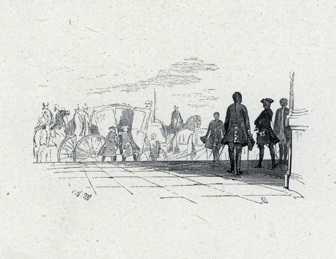 Voiture de voyage de la princesse Ulrike vers lequel Frédéric s'avance.
