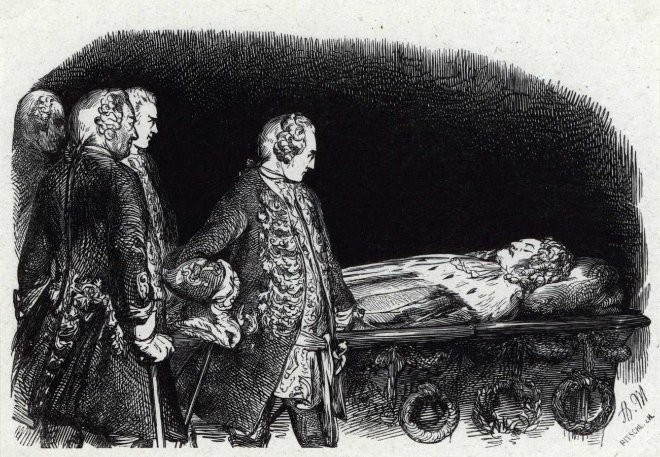Frédéric devant le cercueil ouvert du grand prince électeur.