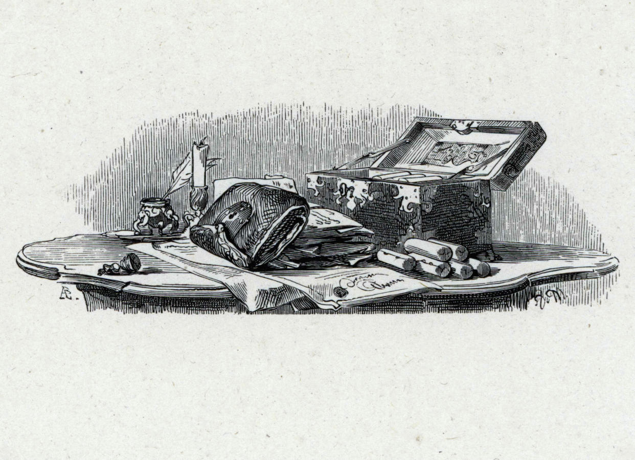 Un dessus de table ovale avec une caissette d'argent, des rouleaux d'argent, du papier, des enveloppes sur les titres d'emprunt relatif au prince héritier