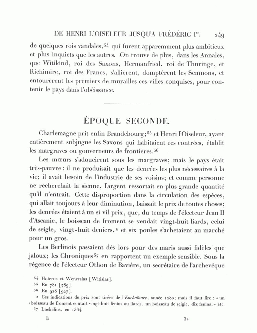 Charlemagne prit enfin Brandebourg;55 et Henri l'Oiseleur, ayant entièrement subjugué les Saxons qui habitaient ces contrées, établit les margraves ou gouverneurs de frontières.56