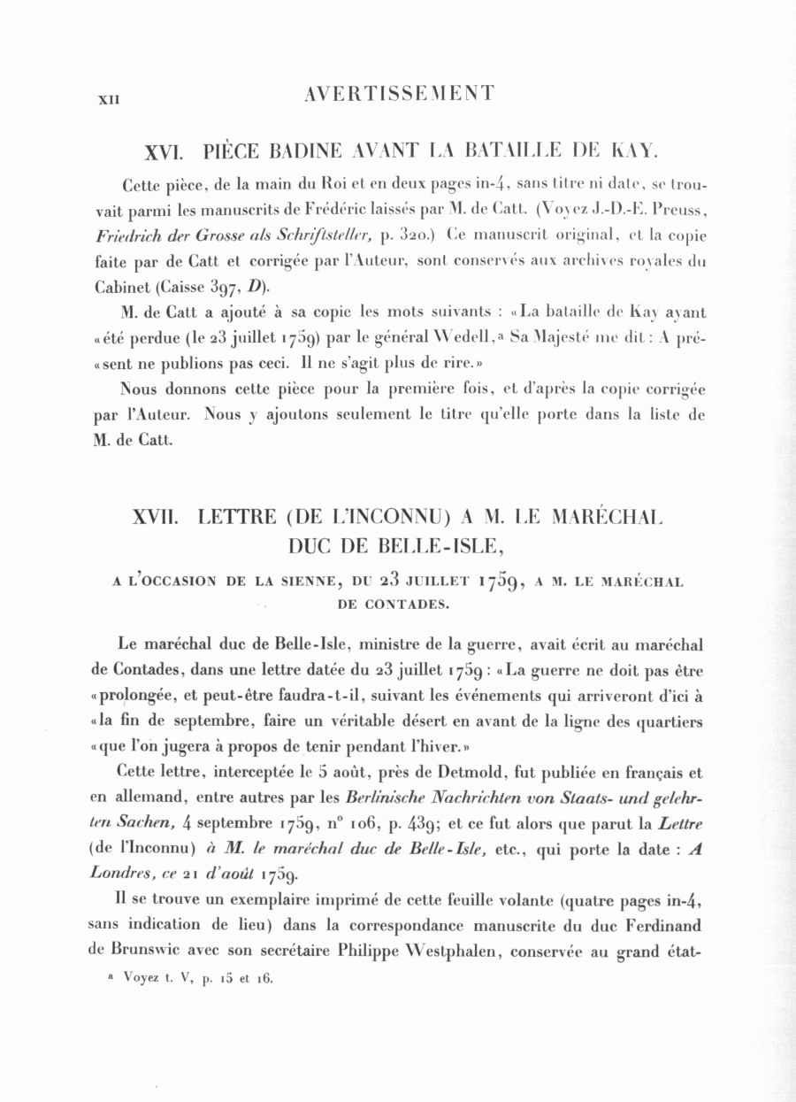 M. de Catt a ajouté à sa copie les mots suivants : « La bataille de Kay ayant été perdue (le 23 juillet 1759) par le général Wedell,a Sa Majesté me dit : A présent ne publions pas ceci. Il ne s'agit plus de rire. »