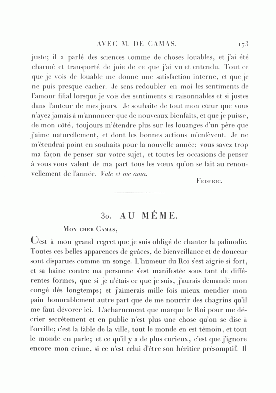 <173> juste; il a parlé des sciences comme de choses louables, et j'ai été charmé et transporté de joie de ce que j'ai vu et entendu. Tout ce que je vois de louable me donne une satisfaction interne, et que je ne puis presque cacher. Je sens redoubler en moi les sentiments de l'amour filial lorsque je vois des sentiments si raisonnables et si justes dans l'auteur de mes jours. Je souhaite de tout mon cœur que vous n'ayez jamais à m'annoncer que de nouveaux bienfaits, et que je puisse, de mon côté, toujours m'étendre plus sur les louanges d'un père que j'aime naturellement, et dont les bonnes actions m'enlèvent. Je ne m'étendrai point en souhaits pour la nouvelle année; vous savez trop ma façon de penser sur votre sujet, et toutes les occasions de penser à vous vous valent de ma part tous les vœux qu'on se fait au renouvellement de l'année. Vale et me ama.
