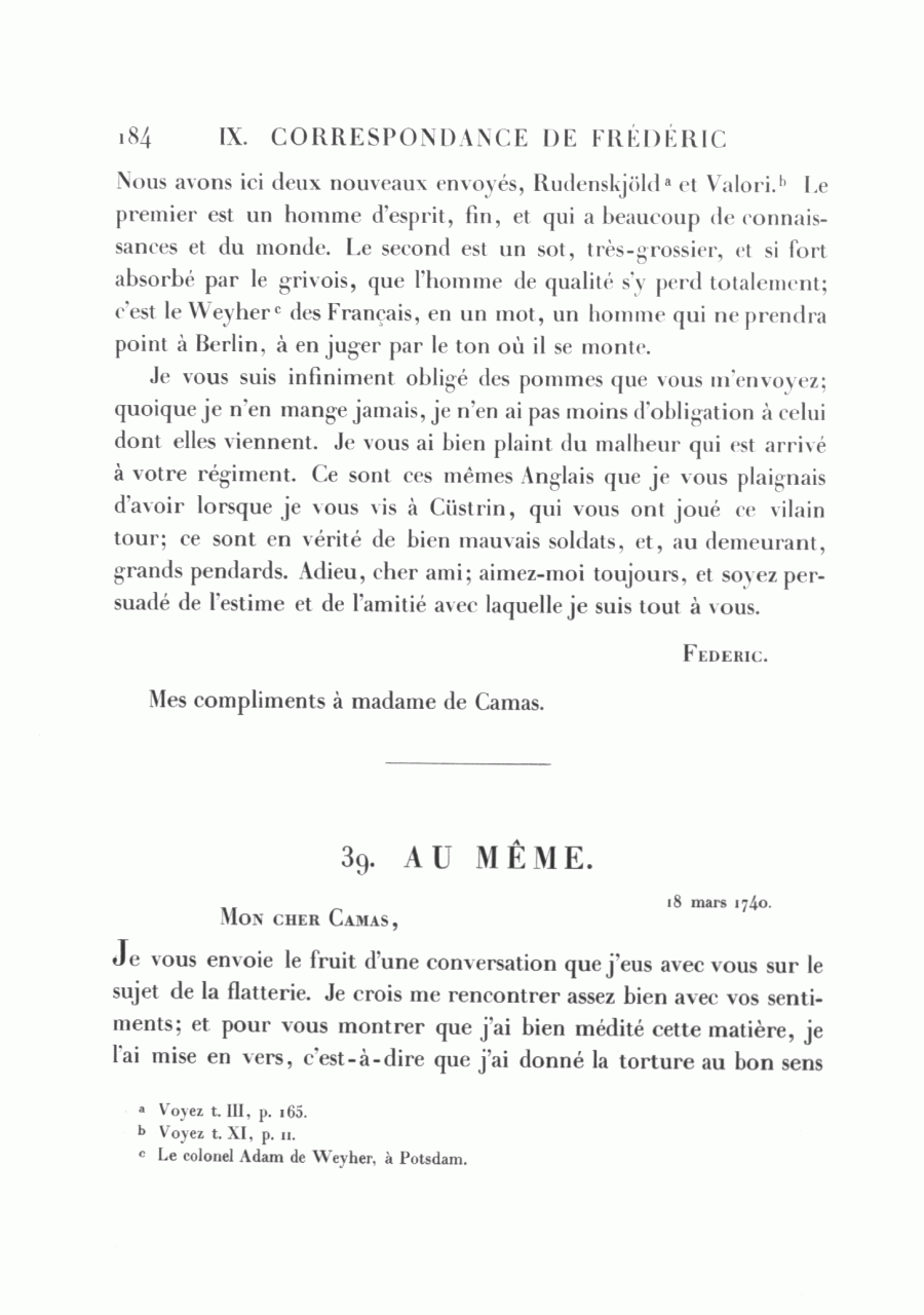 <184> Nous avons ici deux nouveaux envoyés, Rudenskjölda et Valori.b Le premier est un homme d'esprit, fin, et qui a beaucoup de connaissances et du inonde. Le second est un sot, très-grossier, et si fort absorbé par le grivois, que l'homme de qualité s'y perd totalement; c'est le Weyherc des Français, en un mot, un homme qui ne prendra point à Berlin, à en juger par le ton où il se monte.