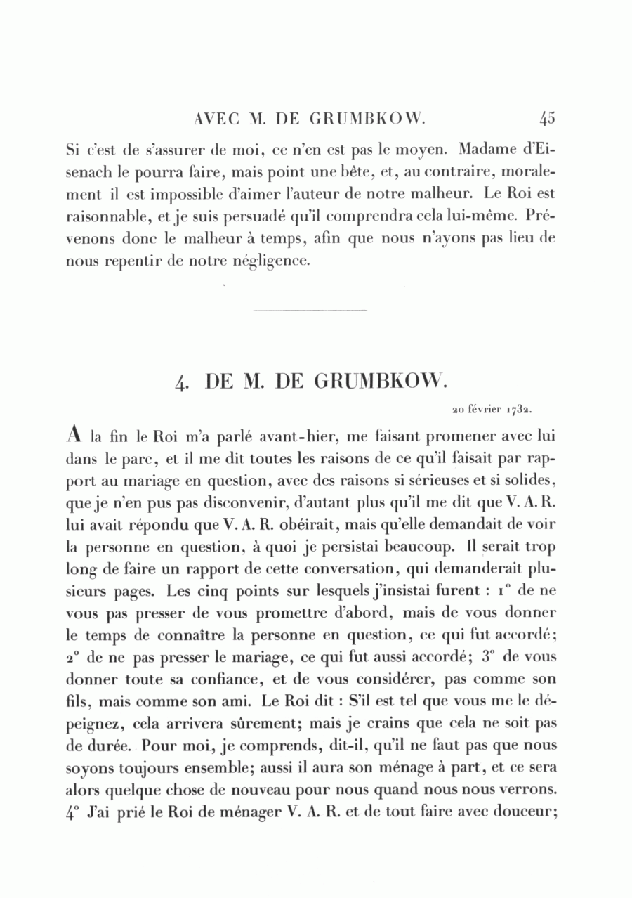 A la fin le Roi m'a parlé avant-hier, me faisant promener avec lui dans le parc, et il me dit toutes les raisons de ce qu'il faisait par rapport au mariage en question, avec des raisons si sérieuses et si solides, que je n'en pus pas disconvenir, d'autant plus qu'il me dit que V. A. R. lui avait répondu que V. A. R. obéirait, mais qu'elle demandait de voir la personne en question, à quoi je persistai beaucoup. Il serait trop long de faire un rapport de cette conversation, qui demanderait plusieurs pages. Les cinq points sur lesquels j'insistai furent : 1o de ne vous pas presser de vous promettre d'abord, mais de vous donner le temps de connaître la personne en question, ce qui fut accordé; 2o de ne pas presser le mariage, ce qui fut aussi accordé; 3o de vous donner toute sa confiance, et de vous considérer, pas comme son fils, mais comme son ami. Le Roi dit : S'il est tel que vous me le dépeignez, cela arrivera sûrement; mais je crains que cela ne soit pas de durée. Pour moi, je comprends, dit-il, qu'il ne faut pas que nous soyons toujours ensemble; aussi il aura son ménage à part, et ce sera alors quelque chose de nouveau pour nous quand nous nous verrons. 4o J'ai prié le Roi de ménager V. A. R. et de tout faire avec douceur;