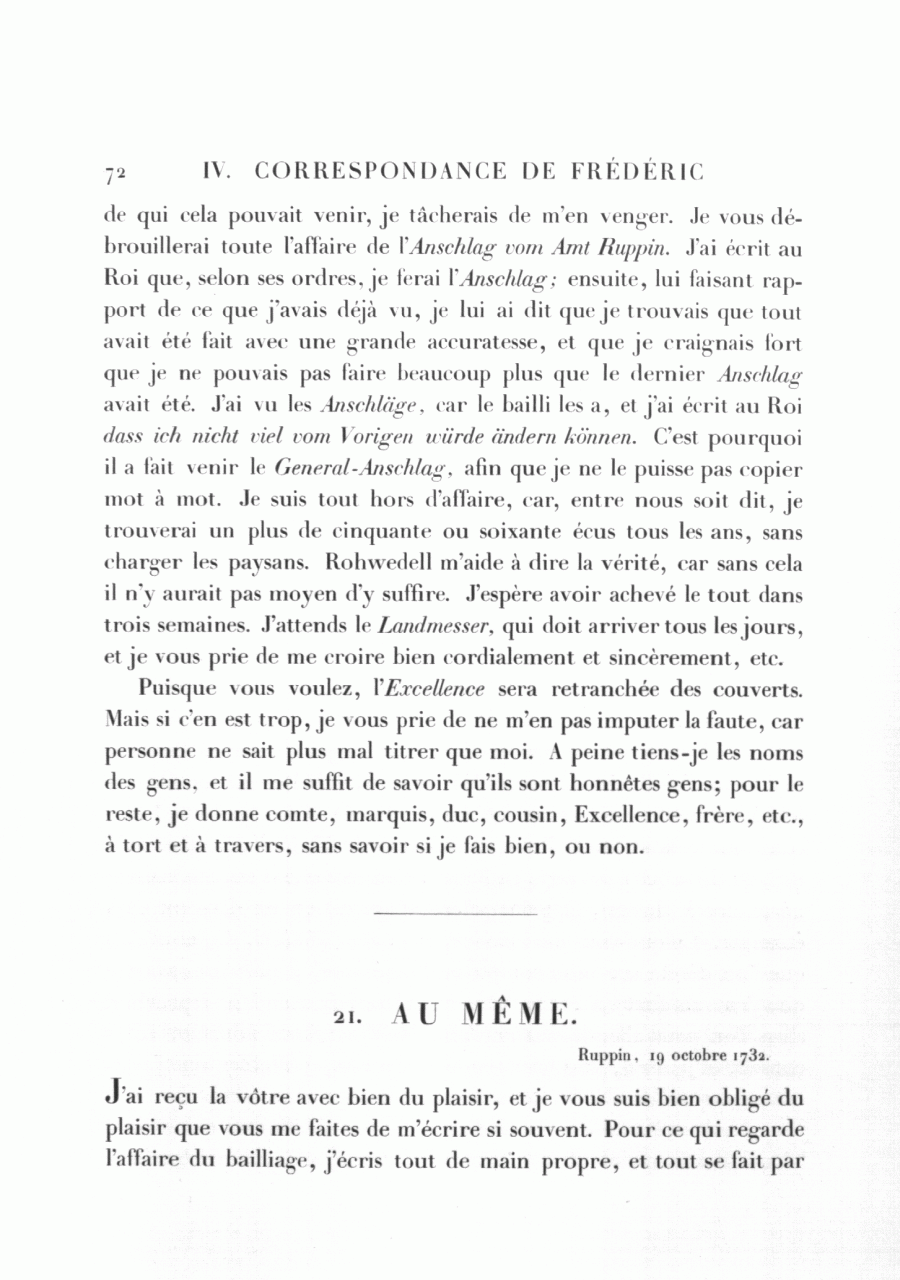 <72> de qui cela pouvait venir, je tâcherais de m'en venger. Je vous débrouillerai toute l'affaire de l'Anschlag vont Amt Ruppin. J'ai écrit au Roi que, selon ses ordres, je ferai l'Anschlag; ensuite, lui faisant rapport de ce que j'avais déjà vu, je lui ai dit que je trouvais que tout avait été fait avec une grande accuratesse, et que je craignais fort que je ne pouvais pas faire beaucoup plus que le dernier Anschlag avait été. J'ai vu les Anschläge, car le bailli les a, et j'ai écrit au Roi dass ich nicht viel vom Vorigen würde ändern können. C'est pourquoi il a fait venir le General-Anschlag, afin que je ne le puisse pas copier mot à mot. Je suis tout hors d'affaire, car, entre nous soit dit, je trouverai un plus de cinquante ou soixante écus tous les ans, sans charger les paysans. Rohwedell m'aide à dire la vérité, car sans cela il n'y aurait pas moyen d'y suffire. J'espère avoir achevé le tout dans trois semaines. J'attends le Landmesser, qui doit arriver tous les jours, et je vous prie de me croire bien cordialement et sincèrement, etc