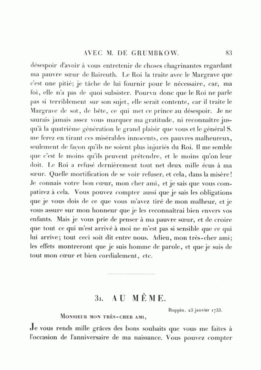 <83> désespoir d'avoir à vous entretenir de choses chagrinantes regardant ma pauvre sœur de Baireuth. Le Roi la traite avec le Margrave que c'est une pitié; je tâche de lui fournir pour le nécessaire, car, ma foi, elle n'a pas de quoi subsister. Pourvu donc que le Roi ne parle pas si terriblement sur son sujet, elle serait contente, car il traite le Margrave de sot, de bête, ce qui met ce prince au désespoir. Je ne saurais jamais assez vous marquer ma gratitude, ni reconnaître jusqu'à la quatrième génération le grand plaisir que vous et le général S. me ferez en tirant ces misérables innocents, ces pauvres malheureux, seulement de façon qu'ils ne soient plus injuriés du Roi. 11 me semble que c'est le moins qu'ils peuvent prétendre, et le moins qu'on leur doit. Le Roi a refusé dernièrement tout net deux mille écus à ma sœur. Quelle mortification de se voir refuser, et cela, dans la misère! Je connais votre bon cœur, mon cher ami, et je sais que vous compatirez à cela. Vous pouvez compter aussi que je sais les obligations que je vous dois de ce que vous m'avez tiré de mon malheur, et je vous assure sur mon honneur que je les reconnaîtrai bien envers vos enfants. Mais je vous prie de penser à ma pauvre sœur, et de croire que tout ce qui m'est arrivé à moi ne m'est pas si sensible que ce qui lui arrive; tout ceci soit dit entre nous. Adieu, mon très-cher ami; les effets montreront que je suis homme de parole, et que je suis de tout mon cœur et bien cordialement, etc.