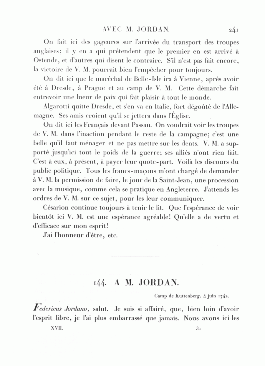 On dit ici les Français devant Passau. On voudrait voir les troupes de V. M. dans l'inaction pendant le reste de la campagne; c'est une belle qu'il faut ménager et ne pas mettre sur les dents. V. M. a supporté jusqu'ici tout le poids de la guerre; ses alliés n'ont rien fait. C'est à eux, à présent, à payer leur quote-part. Voilà les discours du public politique. Tous les francs-maçons m'ont chargé de demander à V. M. la permission de faire, le jour de la Saint-Jean, une procession avec la musique, comme cela se pratique en Angleterre. J'attends les ordres de V. M. sur ce sujet, pour les leur communiquer.