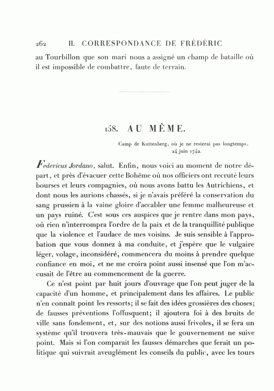 Federicus Jordano, salut. Enfin, nous voici au moment de notre départ, et près d'évacuer cette Bohême où nos officiers ont recruté leurs bourses et leurs compagnies, où nous avons battu les Autrichiens, et dont nous les aurions chassés, si je n'avais préféré la conservation du sang prussien à la vaine gloire d'accabler une femme malheureuse et un pays ruiné. C'est sous ces auspices que je rentre dans mon pays, où rien n'interrompra l'ordre de la paix et de la tranquillité publique que la violence et l'audace de mes voisins. Je suis sensible à l'approbation que vous donnez à ma conduite, et j'espère que le vulgaire léger, volage, inconsidéré, commencera du moins à prendre quelque confiance en moi, et ne me croira point aussi insensé que l'on m'accusait de l'être au commencement de la guerre.