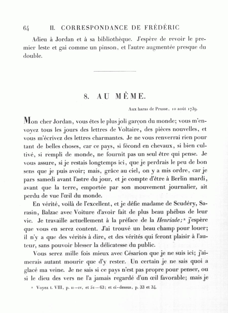 Mon cher Jordan, vous êtes le plus joli garçon du monde; vous m'envoyez tous les jours des lettres de Voltaire, des pièces nouvelles, et vous m'écrivez des lettres charmantes. Je ne vous renverrai rien pour tant de belles choses, car ce pays, si fécond en chevaux, si bien cultivé, si rempli de monde, ne fournit pas un seul être qui pense. Je vous assure, si je restais longtemps ici, que je perdrais le peu de bon sens que je puis avoir; mais, grâce au ciel, on y a mis ordre, car je pars samedi avant l'astre du jour, et je compte d'être à Berlin mardi, avant que la terre, emportée par son mouvement journalier, ait perdu de vue l'œil du monde.