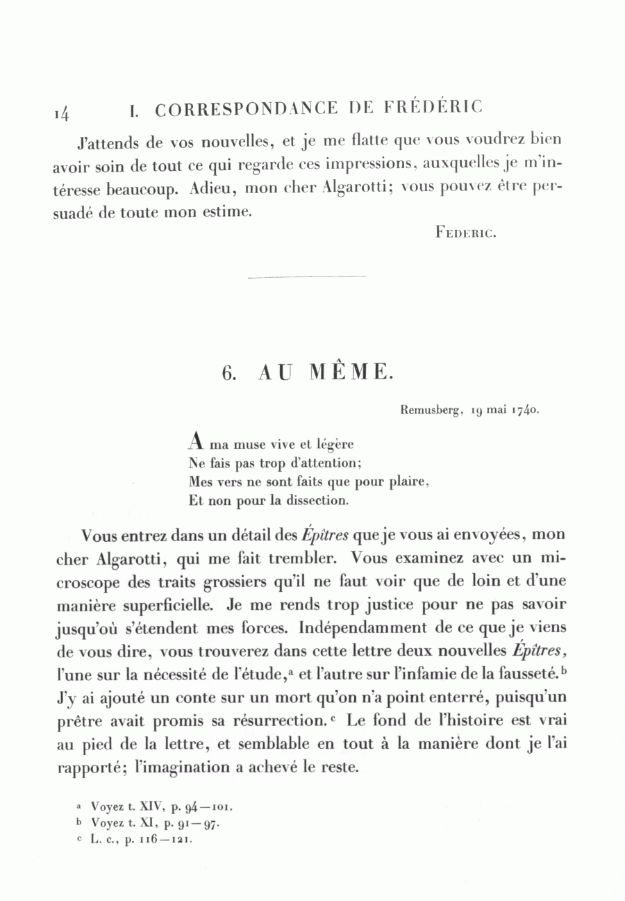 <14>J'attends de vos nouvelles, et je me flatte que vous voudrez bien avoir soin de tout ce qui regarde ces impressions, auxquelles je m'intéresse beaucoup. Adieu, mon cher Algarotti; vous pouvez être persuadé de toute mon estime.