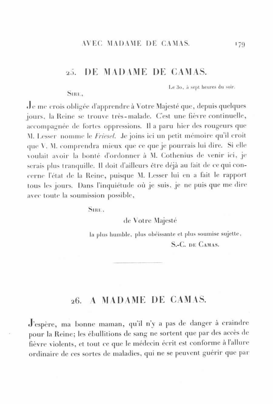 J'espère, ma bonne maman, qu'il n'y a pas de danger à craindre pour la Reine; les ébullitions de sang ne sortent que par des accès de fièvre violents, et tout ce que le médecin écrit est conforme à l'allure ordinaire de ces sortes de maladies, qui ne se peuvent guérir que par