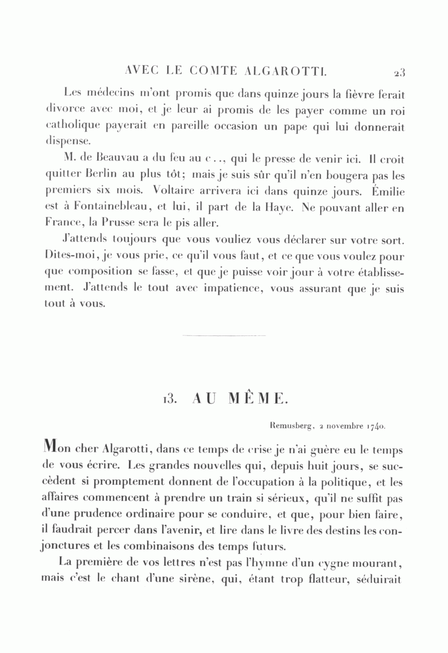 Mon cher Algarotti, dans ce temps de crise je n'ai guère eu le temps de vous écrire. Les grandes nouvelles qui, depuis huit jours, se succèdent si promptement donnent de l'occupation à la politique, et les affaires commencent à prendre un train si sérieux, qu'il ne suffit pas d'une prudence ordinaire pour se conduire, et que, pour bien faire, il faudrait percer dans l'avenir, et lire dans le livre des destins les conjonctures et les combinaisons des temps futurs.
