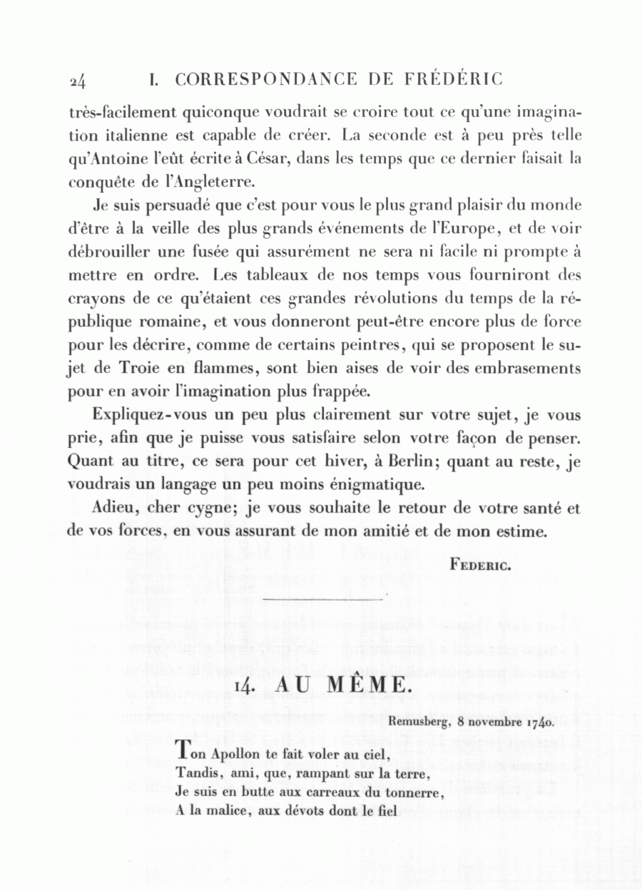 <24> très-facilement quiconque voudrait se croire tout ce qu'une imagination italienne est capable de créer. La seconde est à peu près telle qu'Antoine l'eût écrite à César, dans les temps que ce dernier faisait la conquête de l'Angleterre.