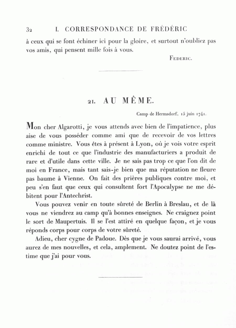 Mon cher Algarotti, je vous attends avec bien de l'impatience, plus aise de vous posséder comme ami que de recevoir de vos lettres comme ministre. Vous êtes à présent à Lyon, où je vois votre esprit enrichi de tout ce que l'industrie des manufacturiers a produit de rare et d'utile dans cette ville. Je ne sais pas trop ce que l'on dit de moi en France, mais tant sais-je bien que ma réputation ne fleure pas baume à Vienne. On fait des prières publiques contre moi, et peu s'en faut que ceux qui consultent fort l'Apocalypse ne me débitent pour l'Antechrist.