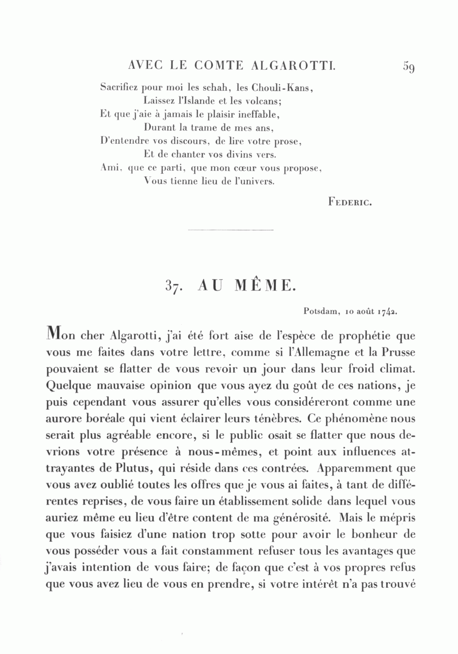 Frédéric au comte Algarotti, Potsdam, 10 août 1742Id: d385_ag509-18_002037000