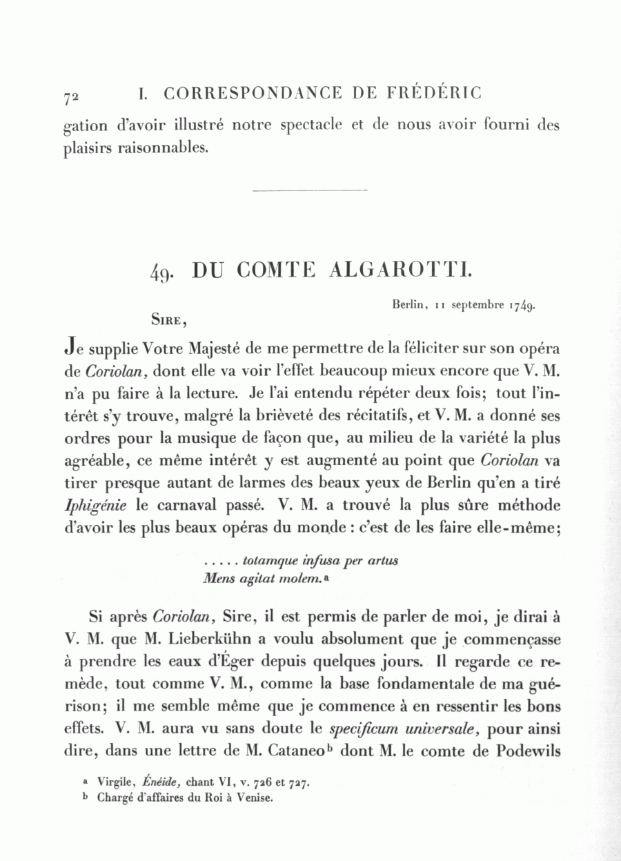 Je supplie Votre Majesté de me permettre de la féliciter sur son opéra de Coriolan, dont elle va voir l'effet beaucoup mieux encore que V. M. n'a pu faire à la lecture. Je l'ai entendu répéter deux fois; tout l'intérêt s'y trouve, malgré la brièveté des récitatifs, et V. M. a donné ses ordres pour la musique de façon que, au milieu de la variété la plus agréable, ce même intérêt y est augmenté au point que Coriolan va tirer presque autant de larmes des beaux yeux de Berlin qu'en a tiré Iphigénie le carnaval passé. V. M. a trouvé la plus sûre méthode d'avoir les plus beaux opéras du monde : c'est de les faire elle-même;