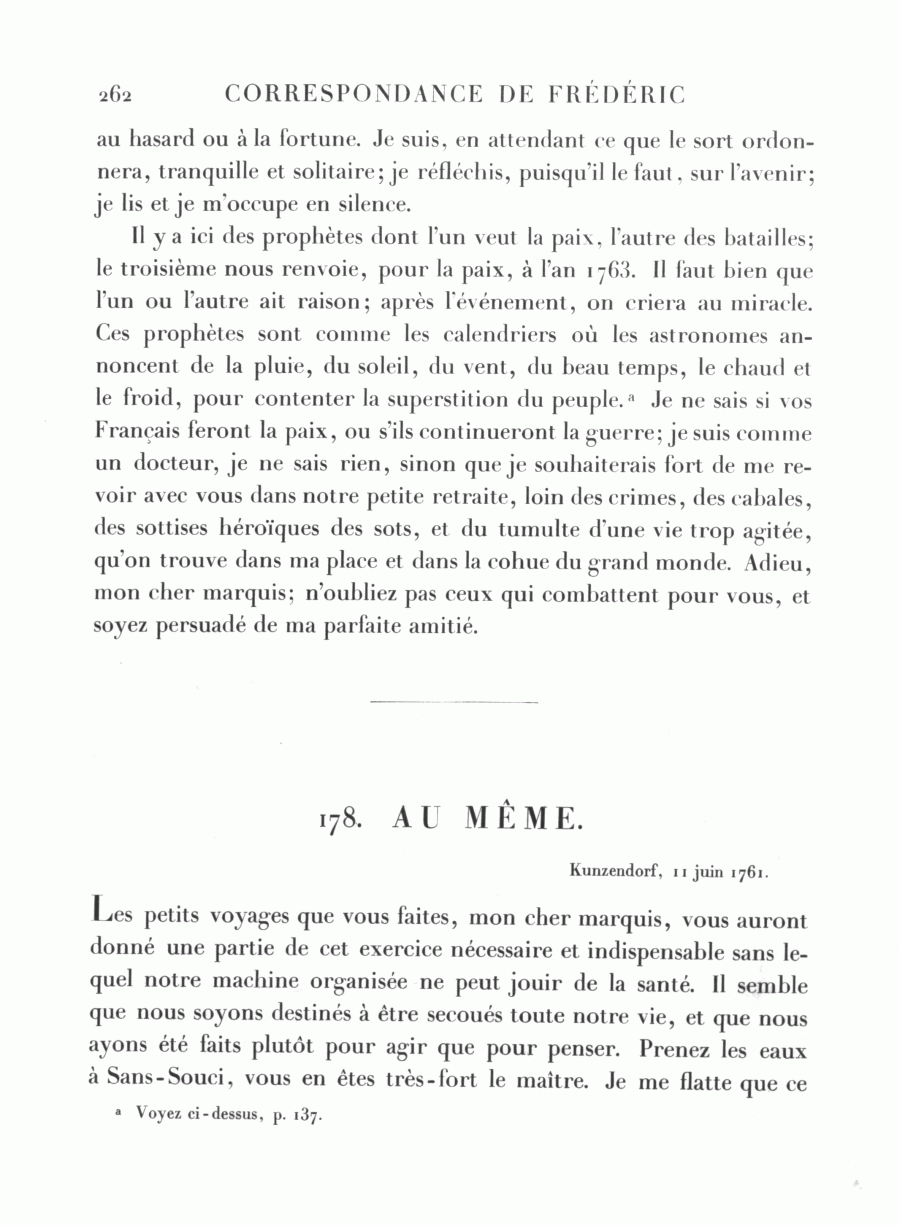 Il y a ici des prophètes dont l'un veut la paix, l'autre des batailles; le troisième nous renvoie, pour la paix, à l'an 1763. Il faut bien que l'un ou l'autre ait raison; après l'événement, on criera au miracle. Ces prophètes sont comme les calendriers où les astronomes annoncent de la pluie, du soleil, du vent, du beau temps, le chaud et le froid, pour contenter la superstition du peuple.a Je ne sais si vos Français feront la paix, ou s'ils continueront la guerre; je suis comme un docteur, je ne sais rien, sinon que je souhaiterais fort de me revoir avec vous dans notre petite retraite, loin des crimes, des cabales, des sottises héroïques des sots, et du tumulte d'une vie trop agitée, qu'on trouve dans ma place et dans la cohue du grand monde. Adieu, mon cher marquis; n'oubliez pas ceux qui combattent pour vous, et soyez persuadé de ma parfaite amitié.