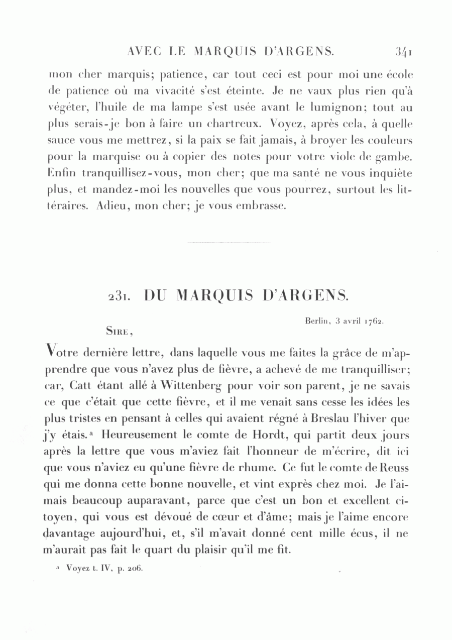 <341> mon cher marquis; patience, car tout ceci est pour moi une école de patience où ma vivacité s'est éteinte. Je ne vaux plus rien qu'à végéter, l'huile de ma lampe s'est usée avant le lumignon; tout au plus serais-je bon à faire un chartreux. Voyez, après cela, à quelle sauce vous me mettrez, si la paix se fait jamais, à broyer les couleurs pour la marquise ou à copier des notes pour votre viole de gambe. Enfin tranquillisez-vous, mon cher; que ma santé ne vous inquiète plus, et mandez-moi les nouvelles que vous pourrez, surtout les littéraires. Adieu, mon cher; je vous embrasse.