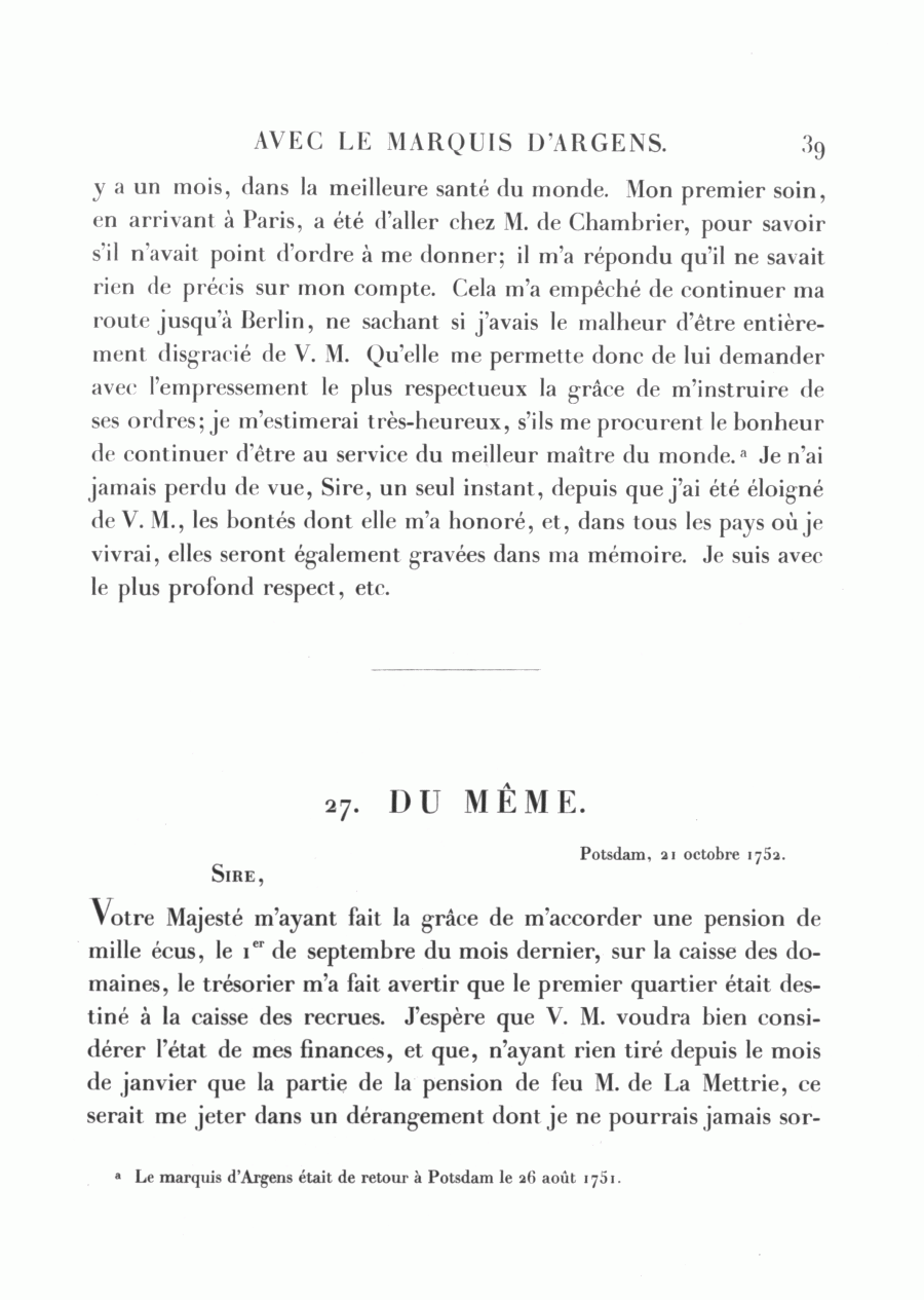 <39> y a un mois, dans la meilleure santé du monde. Mon premier soin, en arrivant à Paris, a été d'aller chez M. de Chambrier, pour savoir s'il n'avait point d'ordre à me donner; il m'a répondu qu'il ne savait rien de précis sur mon compte. Cela m'a empêché de continuer ma route jusqu'à Berlin, ne sachant si j'avais le malheur d'être entièrement disgracié de V. M. Qu'elle me permette donc de lui demander avec l'empressement le plus respectueux la grâce de m'instruire de ses ordres; je m'estimerai très-heureux, s'ils me procurent le bonheur de continuer d'être au service du meilleur maître du monde.a Je n'ai jamais perdu de vue, Sire, un seul instant, depuis que j'ai été éloigné de V. M., les bontés dont elle m'a honoré, et, dans tous les pays où je vivrai, elles seront également gravées dans ma mémoire. Je suis avec le plus profond respect, etc.