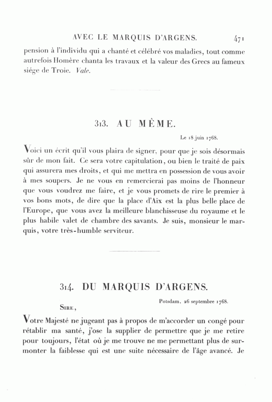 Voici un écrit qu'il vous plaira de signer, pour que je sois désormais sûr de mon fait. Ce sera votre capitulation, ou bien le traité de paix qui assurera mes droits, et qui me mettra en possession de vous avoir à mes soupers. Je ne vous en remercierai pas moins de l'honneur que vous voudrez me faire, et je vous promets de rire le premier à vos bons mots, de dire que la place d'Aix est la plus belle place de l'Europe, que vous avez la meilleure blanchisseuse du royaume et le plus habile valet de chambre des savants. Je suis, monsieur le marquis, votre très-humble serviteur.