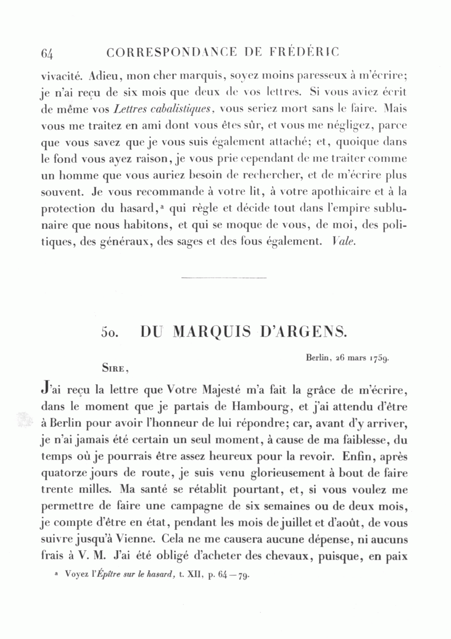 <64> vivacité. Adieu, mon cher marquis, soyez moins paresseux à m'écrire; je n'ai reçu de six mois que deux de vos lettres. Si vous aviez écrit de même vos Lettres cabalistiques, vous seriez mort sans le faire. Mais vous me traitez en ami dont vous êtes sûr, et vous me négligez, parce que vous savez que je vous suis également attaché; et, quoique dans le fond vous ayez raison, je vous prie cependant de me traiter comme un homme que vous auriez besoin de rechercher, et de m'écrire plus souvent. Je vous recommande à votre lit, à votre apothicaire et à la protection du hasard,a qui règle et décide tout dans l'empire sublunaire que nous habitons, et qui se moque de vous, de moi, des politiques, des généraux, des sages et des fous également. Vale.