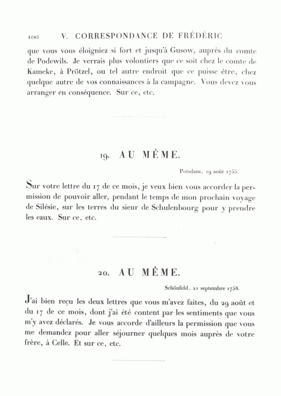 Sur votre lettre du 17 de ce mois, je veux bien vous accorder la permission de pouvoir aller, pendant le temps de mon prochain voyage de Silésie, sur les terres du sieur de Schulenbourg pour y prendre les eaux. Sur ce, etc.