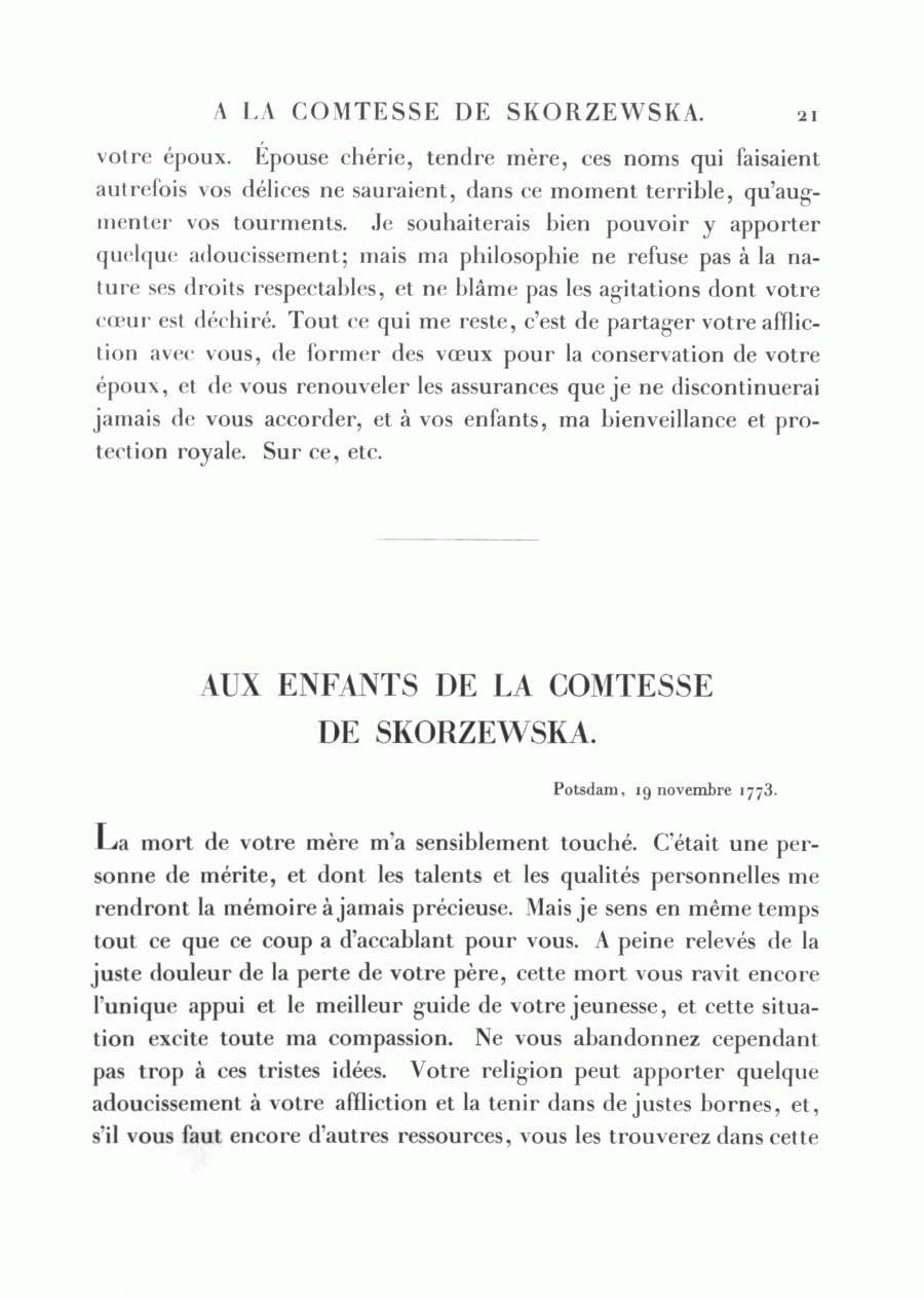 <21> votre époux. Épouse chérie, tendre mère, ces noms qui faisaient autrefois vos délices ne sauraient, dans ce moment terrible, qu'augmenter vos tourments. Je souhaiterais bien pouvoir y apporter quelque adoucissement; mais ma philosophie ne refuse pas à la nature ses droits respectables, et ne blâme pas les agitations dont votre cœur est déchiré. Tout ce qui me reste, c'est de partager votre affliction avec vous, de former des vœux pour la conservation de votre époux, et de vous renouveler les assurances que je ne discontinuerai jamais de vous accorder, et à vos enfants, ma bienveillance et protection royale. Sur ce, etc.