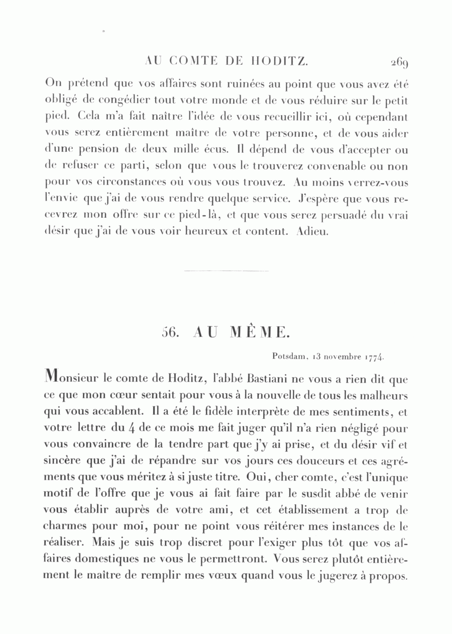 Monsieur le comte de Hoditz, l'abbé Bastiani ne vous a rien dit que ce que mon cœur sentait pour vous à la nouvelle de tous les malheurs qui vous accablent. Il a été le fidèle interprète de mes sentiments, et votre lettre du 4 de ce mois me fait juger qu'il n'a rien négligé pour vous convaincre de la tendre part que j'y ai prise, et du désir vif et sincère que j'ai de répandre sur vos jours ces douceurs et ces agréments que vous méritez à si juste titre. Oui, cher comte, c'est l'unique motif de l'offre que je vous ai fait faire par le susdit abbé de venir vous établir auprès de votre ami, et cet établissement a trop de charmes pour moi, pour ne point vous réitérer mes instances de le réaliser. Mais je suis trop discret pour l'exiger plus tôt que vos affaires domestiques ne vous le permettront. Vous serez plutôt entièrement le maître de remplir mes vœux quand vous le jugerez à propos.