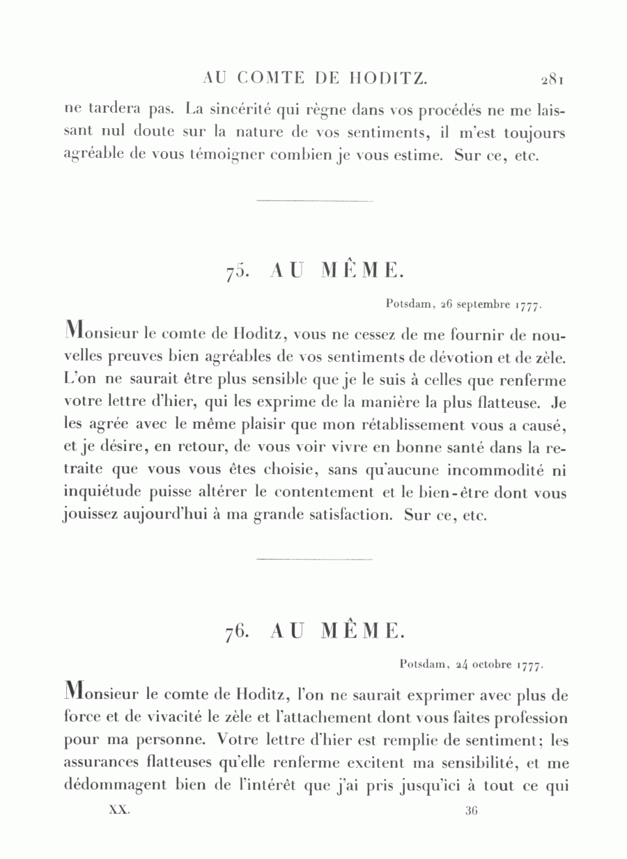 Monsieur le comte de Hoditz, l'on ne saurait exprimer avec plus de force et de vivacité le zèle et l'attachement dont vous faites profession pour ma personne. Votre lettre d'hier est remplie de sentiment; les assurances flatteuses qu'elle renferme excitent ma sensibilité, et me dédommagent bien de l'intérêt que j'ai pris jusqu'ici à tout ce qui