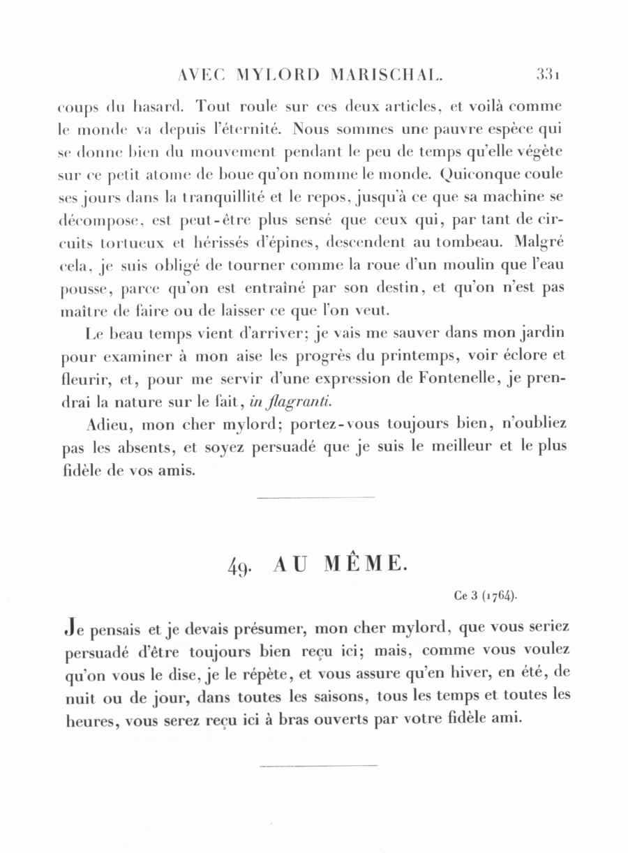 Je pensais et je devais présumer, mon cher mylord, que vous seriez persuadé d'être toujours bien reçu ici; mais, comme vous voulez qu'on vous le dise, je le répète, et vous assure qu'en hiver, en été, de nuit ou de jour, dans toutes les saisons, tous les temps et toutes les heures, vous serez reçu ici à bras ouverts par votre fidèle ami.