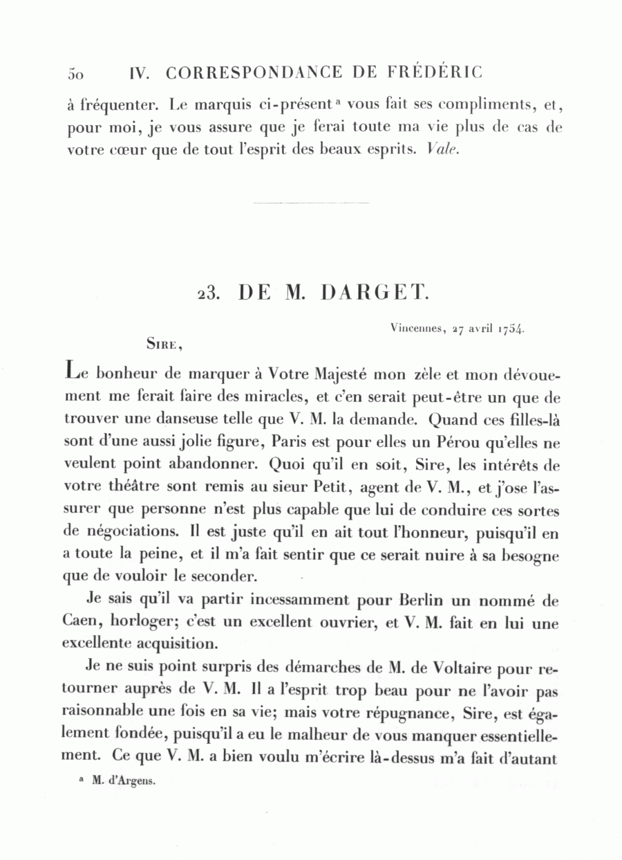 Je ne suis point surpris des démarches de M. de Voltaire pour retourner auprès de V. M. Il a l'esprit trop beau pour ne l'avoir pas raisonnable une fois en sa vie; mais votre répugnance, Sire, est également fondée, puisqu'il a eu le malheur de vous manquer essentiellement. Ce que V. M. a bien voulu m'écrire là-dessus m'a fait d'autant
