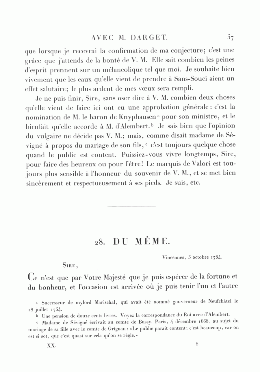 Je ne puis finir, Sire, sans oser dire à V. M. combien deux choses qu'elle vient de faire ici ont eu une approbation générale : c'est la nomination de M. le baron de Knyphausena pour son ministre, et le bienfait qu'elle accorde à M. d'Alembert.b Je sais bien que l'opinion du vulgaire ne décide pas V. M.; mais, comme disait madame de Sévigné à propos du mariage de son fils,c c'est toujours quelque chose quand le public est content. Puissiez-vous vivre longtemps, Sire, pour faire des heureux ou pour l'être! Le marquis de Valori est toujours plus sensible à l'honneur du souvenir de V. M., et se met bien sincèrement et respectueusement à ses pieds. Je suis, etc.