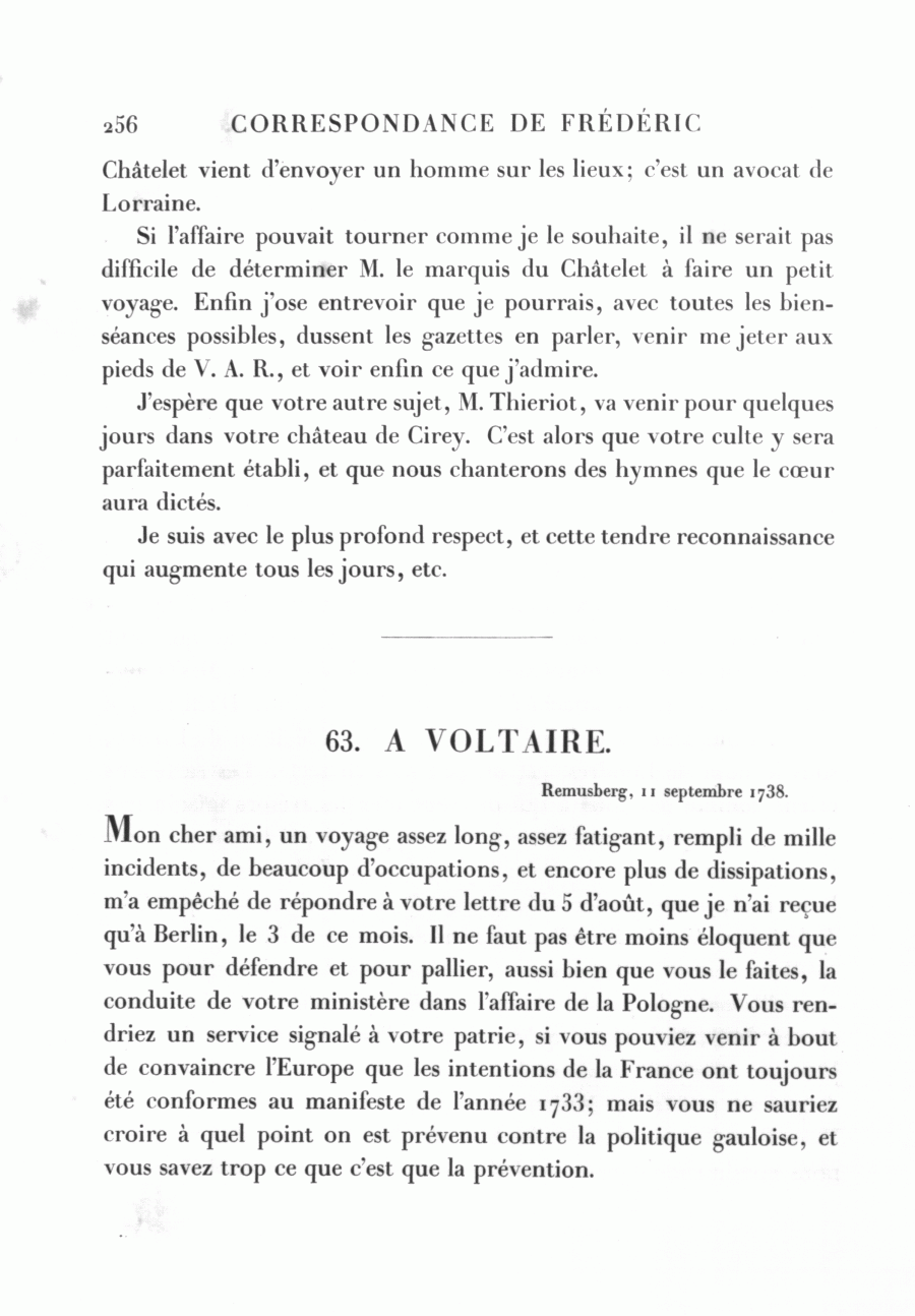 Si l'affaire pouvait tourner comme je le souhaite, il ne serait pas difficile de déterminer M. le marquis du Châtelet à faire un petit voyage. Enfin j'ose entrevoir que je pourrais, avec toutes les bienséances possibles, dussent les gazettes en parler, venir me jeter aux pieds de V. A. R., et voir enfin ce que j'admire.