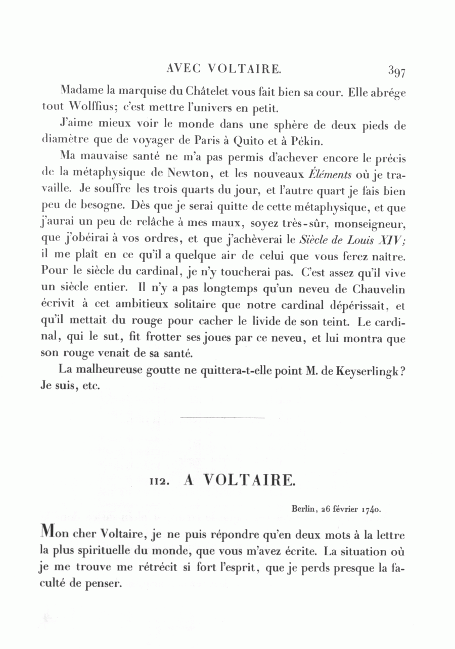 <397>Madame la marquise du Châtelet vous fait bien sa cour. Elle abrége tout Wolffius; c'est mettre l'univers en petit.
