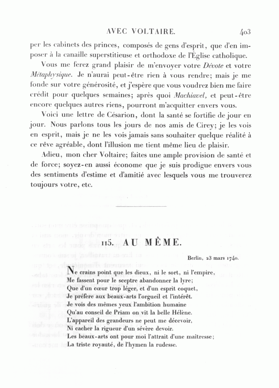 Vous me ferez grand plaisir de m'envoyer votre Dévote et votre Métaphysique. Je n'aurai peut-être rien à vous rendre; mais je me fonde sur votre générosité, et j'espère que vous voudrez bien me faire crédit pour quelques semaines; après quoi Machiavel, et peut-être encore quelques autres riens, pourront m'acquitter envers vous.