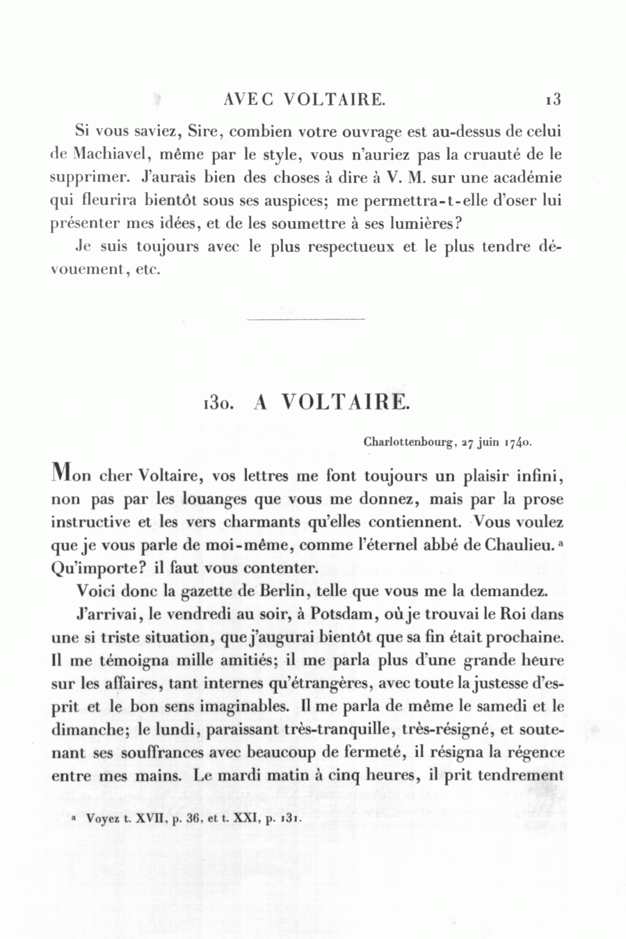 <13>Si vous saviez, Sire, combien votre ouvrage est au-dessus de celui de Machiavel, même par le style, vous n'auriez pas la cruauté de le supprimer. J'aurais bien des choses à dire à V. M. sur une académie qui fleurira bientôt sous ses auspices; me permettra-t-elle d'oser lui présenter mes idées, et de les soumettre à ses lumières?