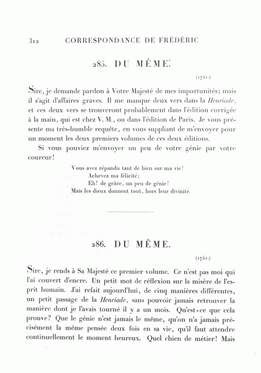 Sire, je rends à Sa Majesté ce premier volume. Ce n'est pas moi qui l'ai couvert d'encre. Un petit mot de réflexion sur la misère de l'esprit humain. J'ai refait aujourd'hui, de cinq manières différentes un petit passage de la Henriade, sans pouvoir jamais retrouver la manière dont je l'avais tourné il y a un mois. Qu'est-ce que cela prouve? Que le génie n'est jamais le même, qu'on n'a jamais précisément la même pensée deux fois en sa vie, qu'il faut attendre continuellement le moment heureux. Quel chien de métier! Mais