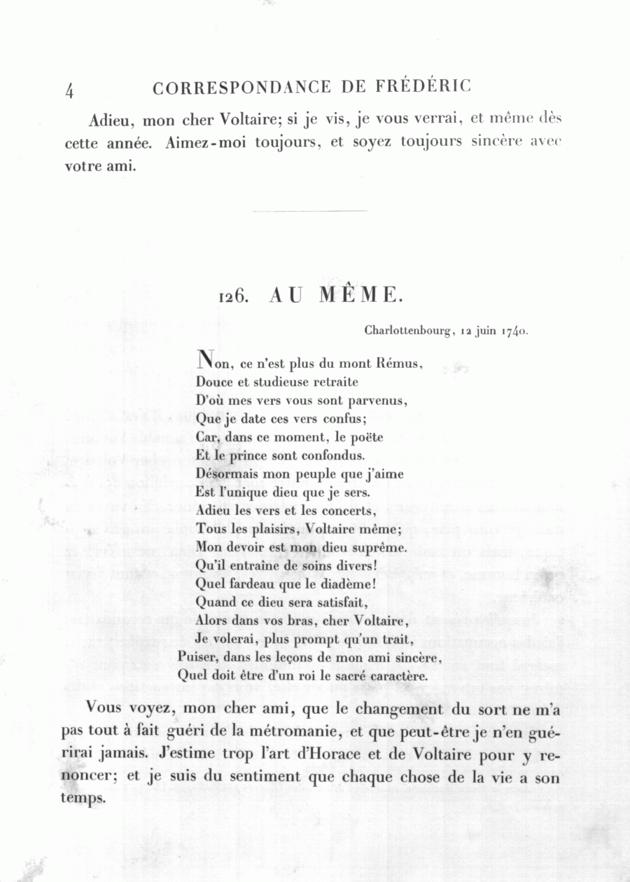 <4>Adieu, mon cher Voltaire; si je vis, je vous verrai, et même dès cette année. Aimez-moi toujours, et soyez toujours sincère avec votre ami.