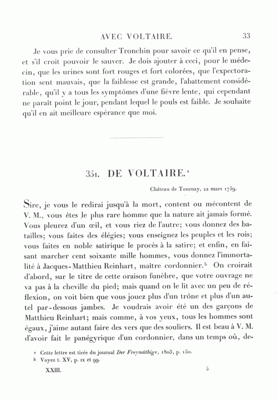 Sire, je vous le redirai jusqu'à la mort, content ou mécontent de V. M., vous êtes le plus rare homme que la nature ait jamais formé. Vous pleurez d'un œil, et vous riez de l'autre; vous donnez des batailles; vous faites des élégies; vous enseignez les peuples et les rois; vous faites en noble satirique le procès à la satire; et enfin, en faisant marcher cent soixante mille hommes, vous donnez l'immortalité à Jacques-Matthieu Reinhart, maître cordonnier.b On croirait d'abord, sur le titre de cette oraison funèbre, que votre ouvrage ne va pas à la cheville du pied; mais quand on le lit avec un peu de réflexion, on voit bien que vous jouez plus d'un trône et plus d'un autel par-dessous jambes. Je voudrais avoir été un des garçons de Matthieu Reinhart; mais comme, à vos yeux, tous les hommes sont égaux, j'aime autant faire des vers que des souliers. Il est beau à V. M. d'avoir fait le panégyrique d'un cordonnier, dans un temps où, de-
